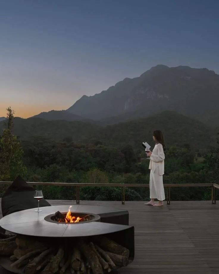 Think: silent mornings, open-air pathways, firelight, steam, wildflowers, and soft architectural curves.